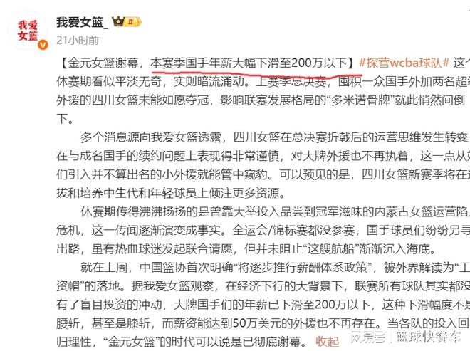 随着WCBA联赛新赛季即将临近,不少球队已经进入到最后备战阶段。而最近这一段时间,坊间却接连传出不利于WCBA联赛和中国女篮的消息。像内蒙古、天津等队,他们已经确定将退赛,无缘WCBA新赛季,而且,女篮联赛新赛季也将开启工资帽模式。另外,根据知情人士透露,女篮球员新赛季年薪也将大幅缩水,这对于女篮国手们,确实是一个不小的打击。但对于中国女篮长远发展角度而言,却是大大的利好。这也是女篮主帅宫鲁鸣最愿意看到的一幕。
